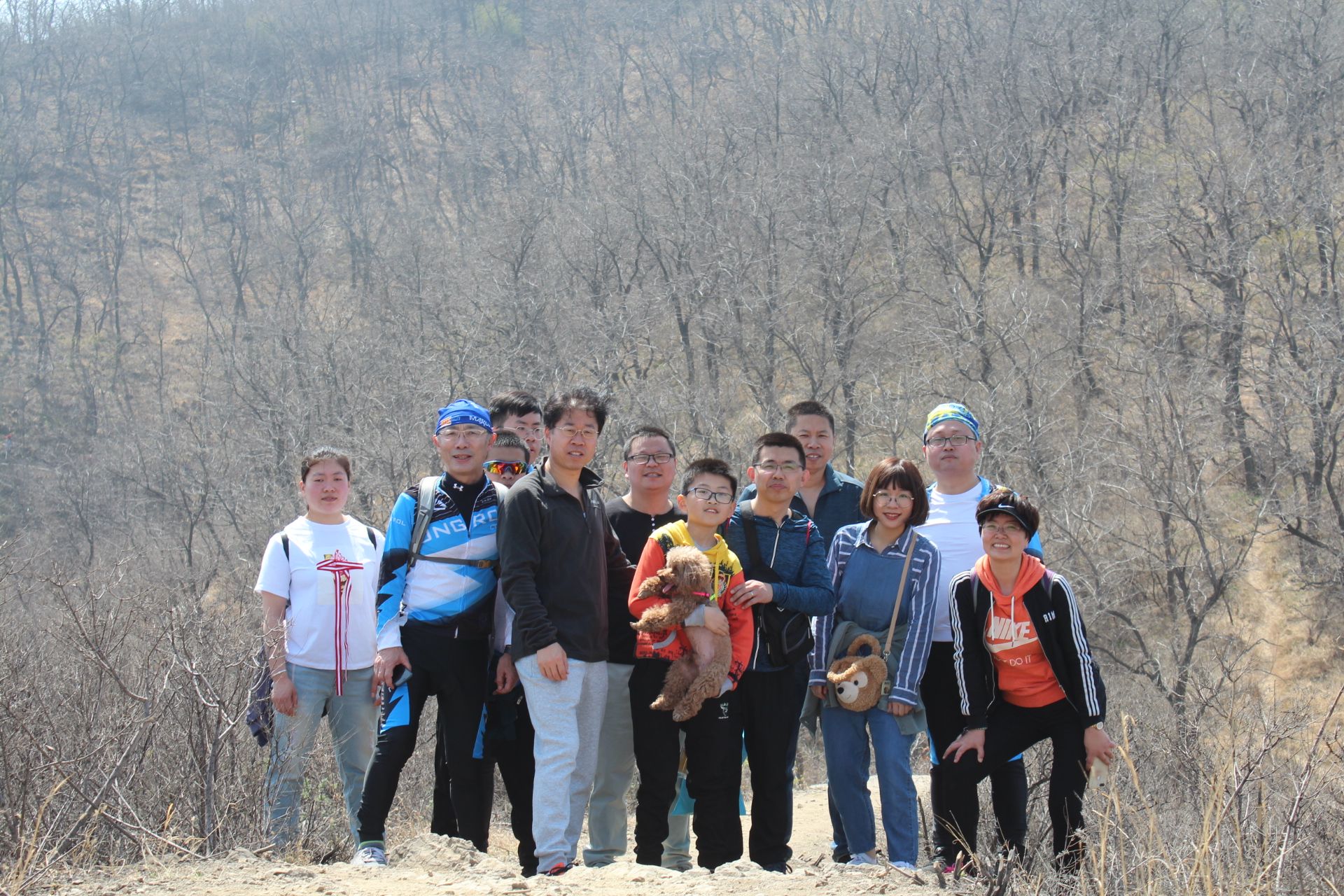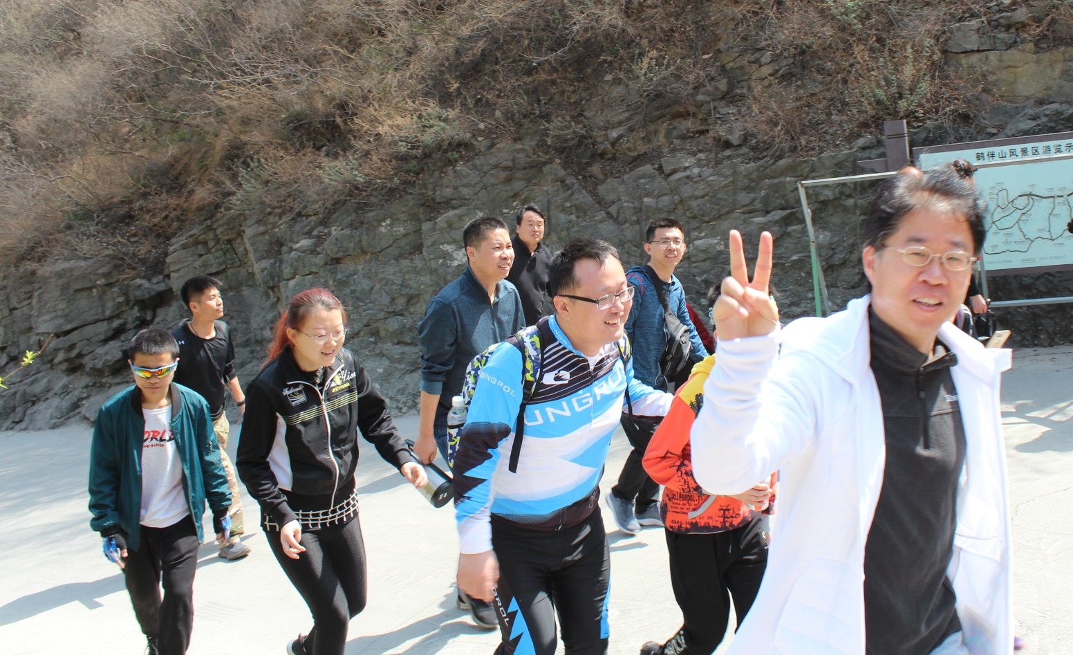 圖為董事、總經(jīng)理楊冰先生(右一)及社團(tuán)成員在爬山途中。
