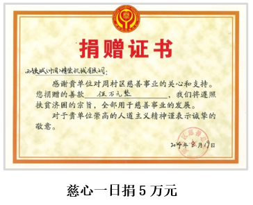 2024年8月份慈心一日捐,公司捐款5萬元,同年11月份再捐款3千元教育慈善基金,共計捐贈5.3萬元。提升奉獻意識,弘揚社會正能量,營造了“人人關心慈善、人人支持慈善、人人參與慈善”的良好氛圍。獲得了當?shù)卣亩啻魏迷u,并榮獲“尊師重教先進單位”榮譽稱號。
